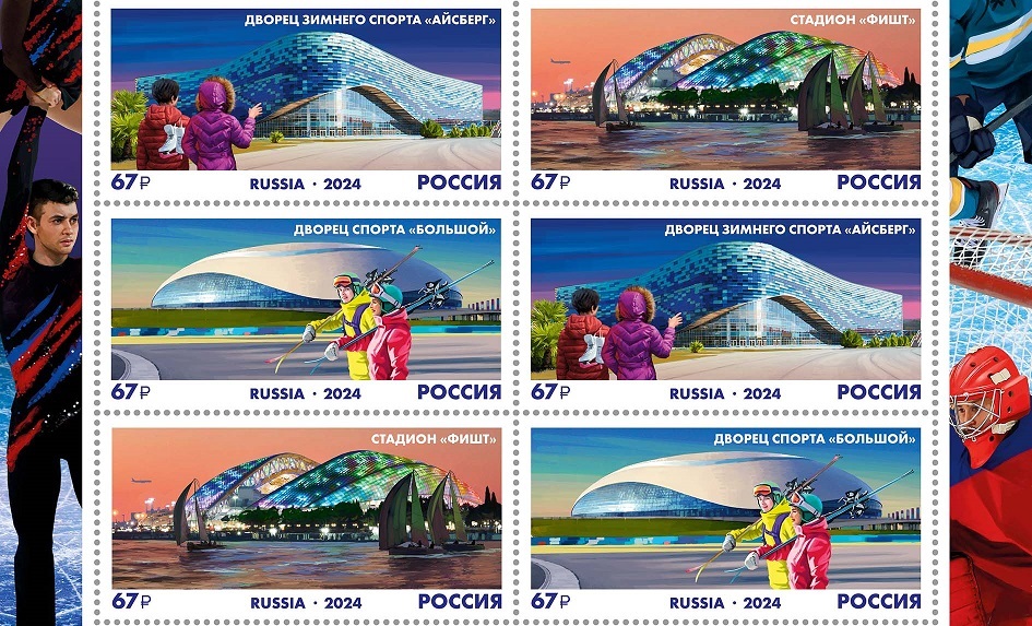 Также, в 2024 году Почта России выпустила марки к 10-летию Зимних игр Сочи-2014. На них изобразили спортивные объекты Олимпийского парка — дворец зимнего спорта «Айсберг», стадион «Фишт» и дворец спорта «Большой». Тираж каждой марки составил 34 тыс. экземпляров, а номинал — 67 рублей.