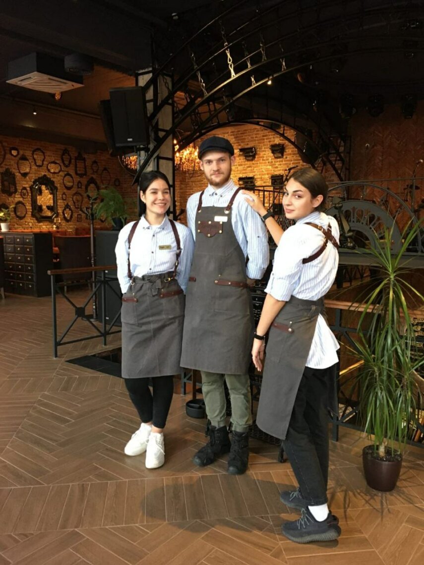 Так как это грузинский ресторан, мы сделали фартук со стилизацией. На нагрудной части грузинского костюма есть газыри, как для патронов. Сейчас этот элемент традиционно остался. И мы карманы сделали с такими элементами, тогда из-за униформы сразу было понятно, что это грузинский ресторан. Клиенту это очень понравилось.