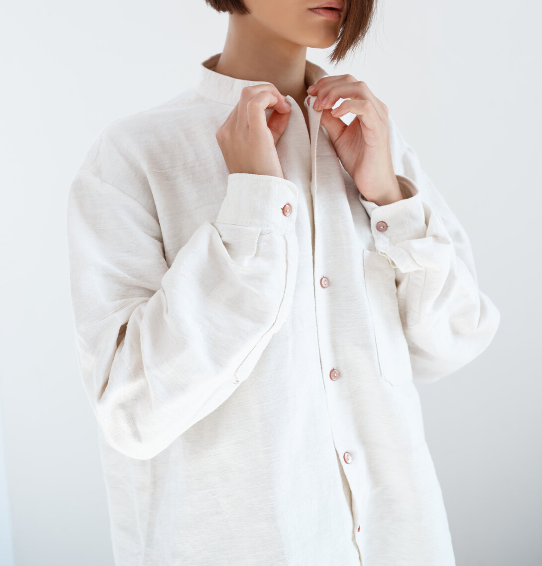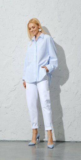 — Рубашка голубого или белого цвета. Как отметила Маргарита Даллакян, данный элемент гардероба должен быть сделан из максимально легких, натуральных тканей — льна или хлопка, и иметь свободный крой. Ее можно использовать и как самостоятельный элемент одежды, и в качестве второго слоя сверху топа или футболки.