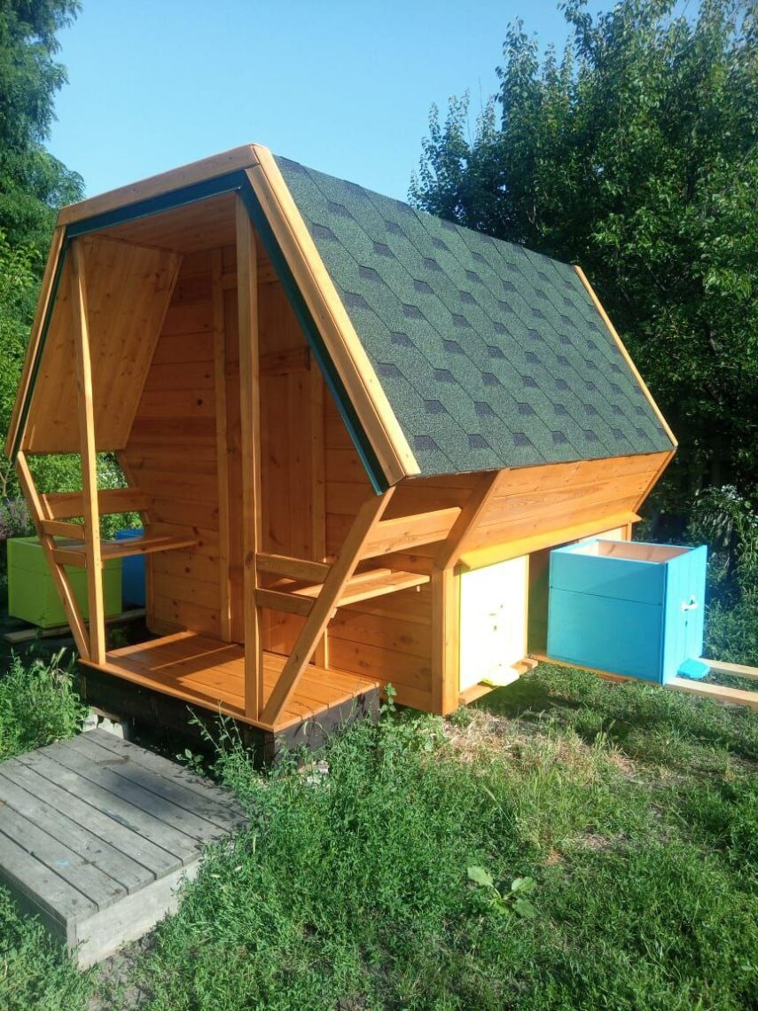 В утепленном строении два спальных места и шесть пчелиных ульев. Примерная себестоимость (без работы) такого строения – тысяч 150, назвать точную сумму мастер затрудняется, потому что, закупая стройматериалы для одного домика, начинает закупать что-то сразу для второго и третьего.