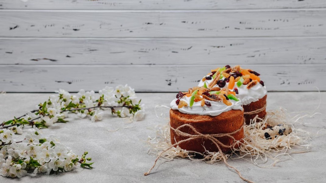 Для украшения используют меренгу: смешивают белок (100 г) и сахар (180 г), после смесь ставят на водяную баню, потом добавляют щепотку соли и перемешивают до растворения сахара. После взбивают венчиком в планетарном блендере. Готовой меренгой украшают куличи, можно обжечь горелкой, добавить свежие цветы и кандурин.