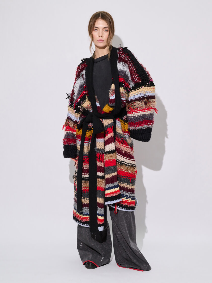 Дизайнеры бренда соединяют плотность и воздушность с сеткой, противопоставляют тяжелые плотные и легчайшие полупрозрачные материалы, что создает почти магический эффект. Идет игра не только на контрасте веса и текстуры, но и на ощущении — открытости и защищенности, хрупкости и силы. Что делает образ объемным и многослойным в прямом и переносном смысле.