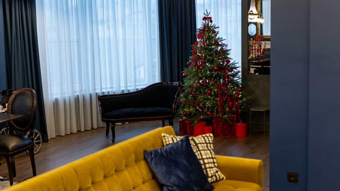 Концепция новогоднего украшения Бутик-отель «39» в 2025 году — мир, где современная эстетика встречается со сказкой. Цветовая палитра: изумрудный, благородное золото. В конференц-зале установлена величественная елка, украшенная хрустальными шарами и игрушками. Пространство дополняют арт-объекты из позолоченных ветвей и тысячи теплых огоньков. Участники корпоративов чаще всего выбирают джаз и лаундж, которые создают уникальную и непринужденную атмосферу. Форматы караоке и рок-вечеринок запрашиваются реже.