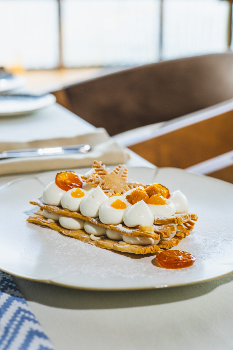 «Мимоза» с подкопченной форелью, мильфей с хурмой и кумкватом, и пирог с томленной уткой.