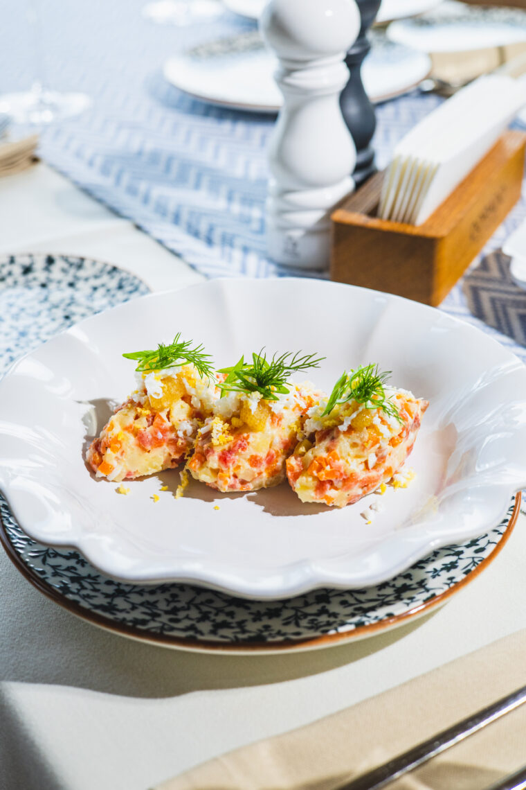 Новогоднее меню в ростовском бистро «Месье Оливье» — это два вида оливье в авторской подаче, паштет из куриной печени с луковым конфитюром, севиче из лосося, донской судак с рататуем из овощей. Шеф винного бистро «Месье Оливье» Александр Лигута предпочитает авторскую версию салата «оливье» с креветками.