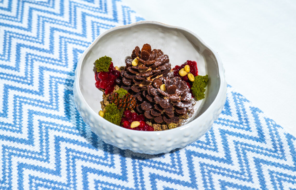 Мини-голубцы с крабами и таежный десерт с шоколадными шишками.