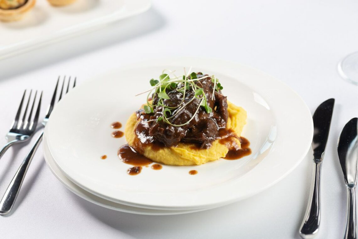 Четвертый курс: нежная утка, томленая в собственном жиру, — классика с донским характером. Сочетается с карамелизированными яблоками, терпкой косточкой дикого абрикоса (как напоминание о степных тропах) и сочной клюквой, которая дарит легкую кислинку и праздничное настроение. Второй вариант мягкое, почти тающее ребро местного бычка с мясным соусом. Подается с запаренной органической полбой и голубым сыром: тепло, сытно, по-домашнему, но с изыском. Пусть гость выбирает — степь или река, фрукт или сыр, легкость или насыщенность.