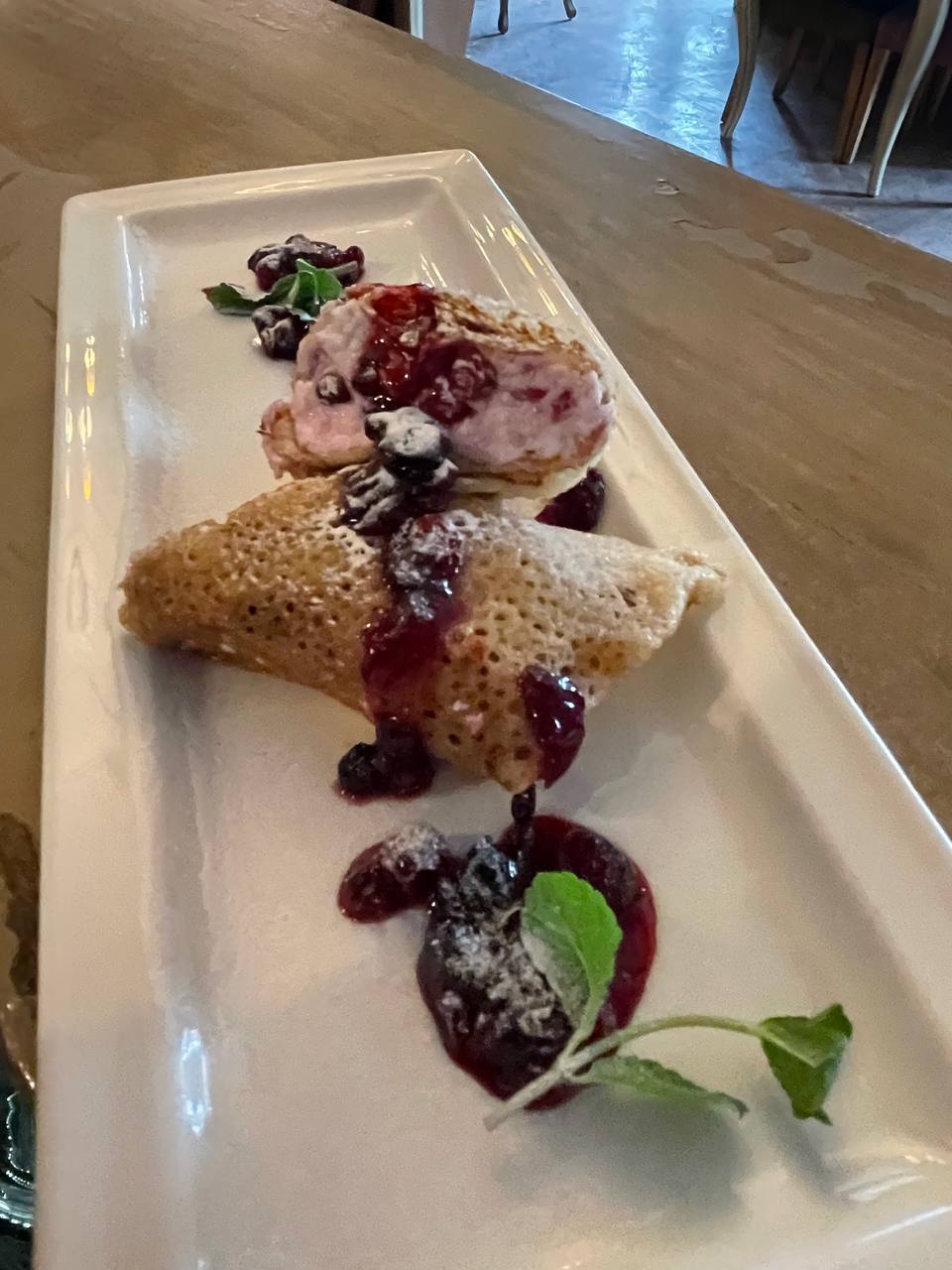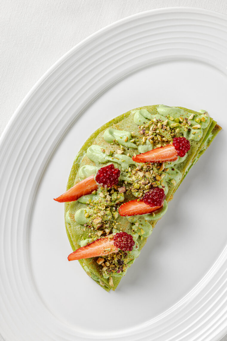 Ингредиенты: блины готовые — 2 шт, сыр камамбер (или бри) — 30 г, соус малиновый густой — 30 г, масло сливочное — 20 г, фисташки очищенные — 5 г, мята свежая — 2 г.
