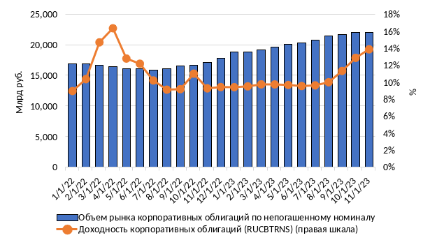 Не вдаваясь в историю рынка корпоративных облигаций, покажем, что такой способ привлечения средств пользуется популярностью среди российского бизнеса любого масштаба. На графике видно, что объем привлечения бизнесом средств в начале ноября 2023 года перешел за отметку в 22 трлн рублей.