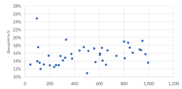 Приведем информацию о представителях сельскохозяйственной отрасли в целом на облигационном рынке. В выборку включено 27 компаний, чья деятельность относится к сельскохозяйственной и осуществляется на западной территории России (до Урала). Ниже на графике представлено отражение текущей взаимосвязи между стоимостью заимствования на рынке (доходностью) и дюрацией (сроком до погашения ценных бумаг, то есть сроком до возврата долга в полном объеме).