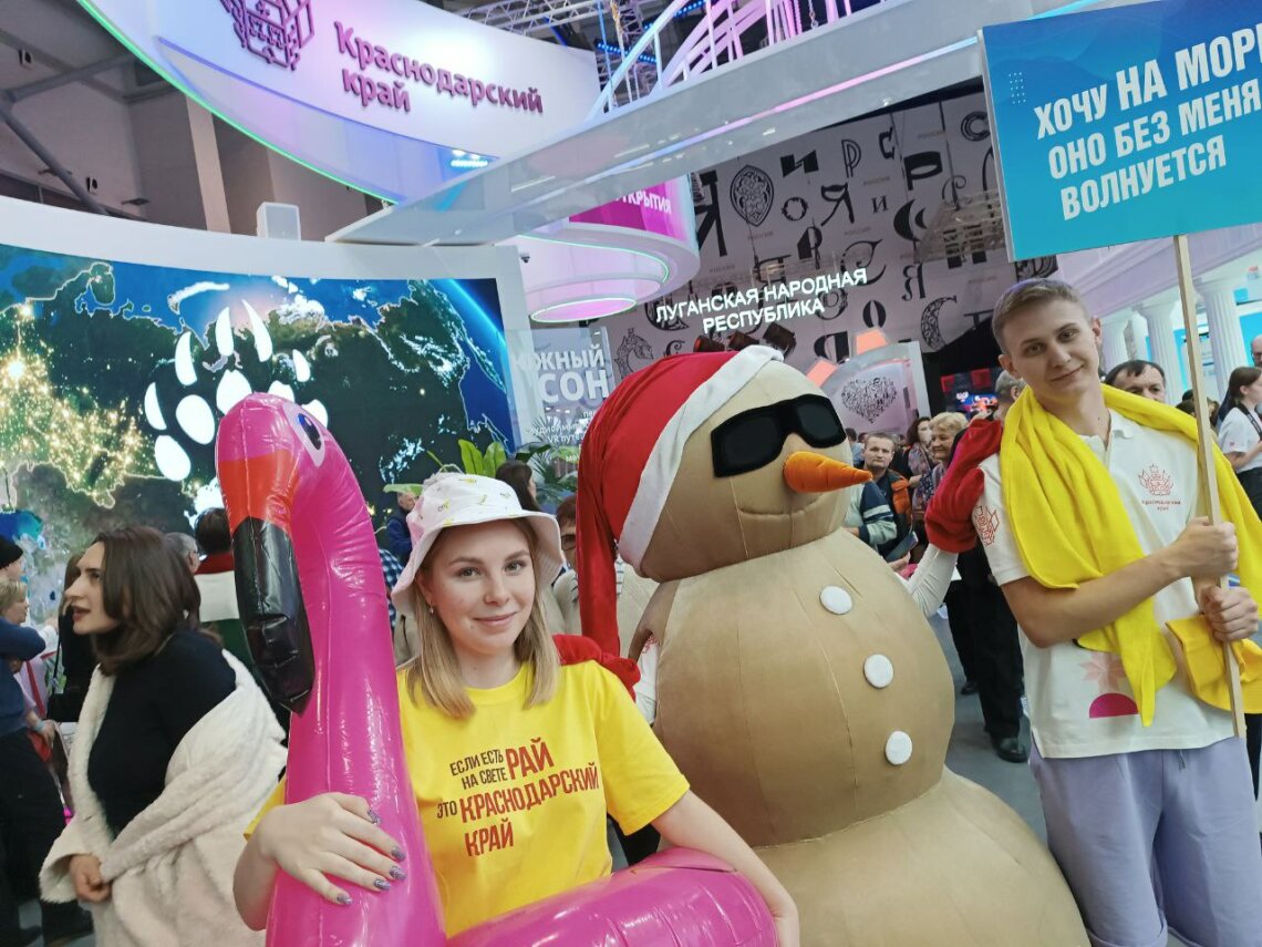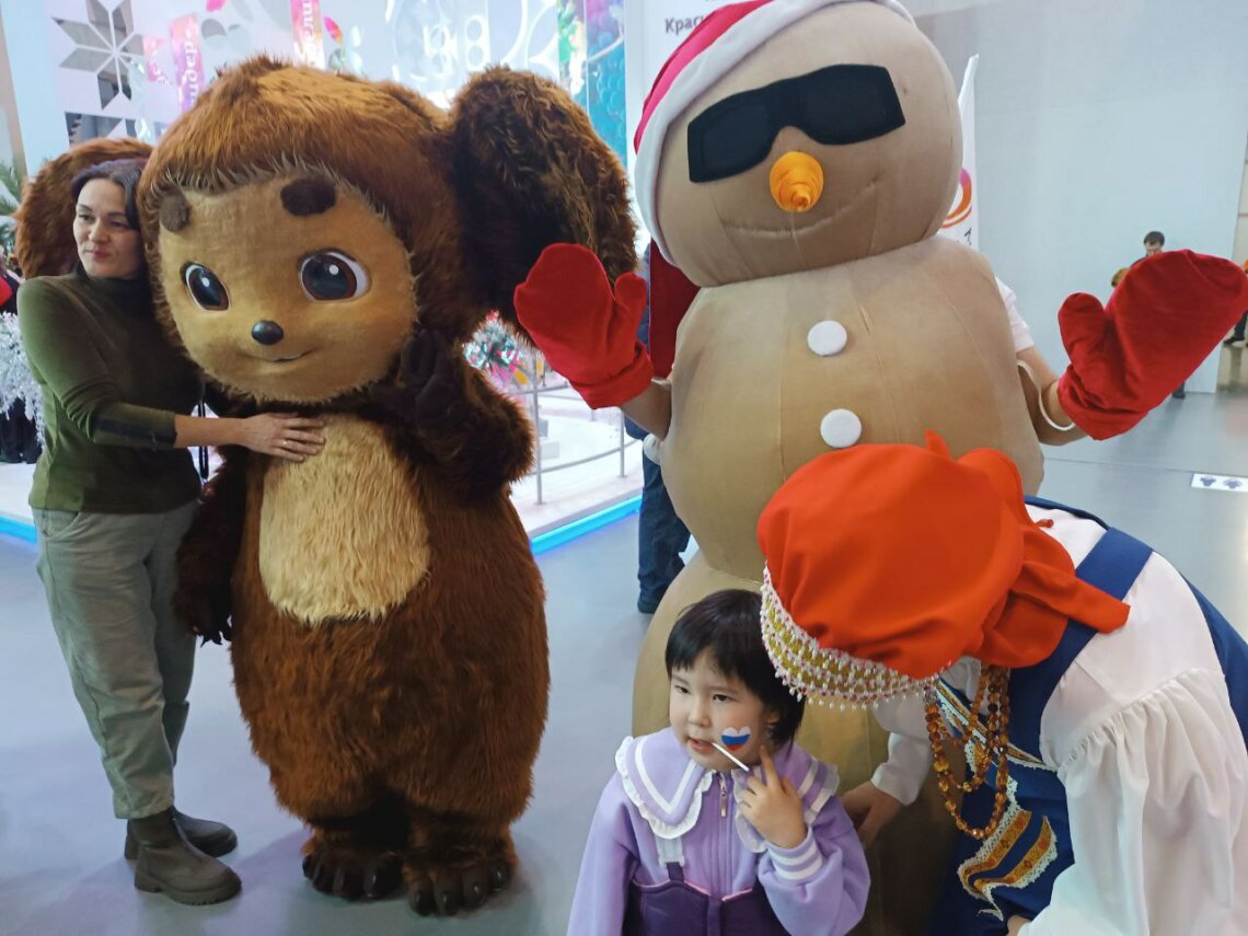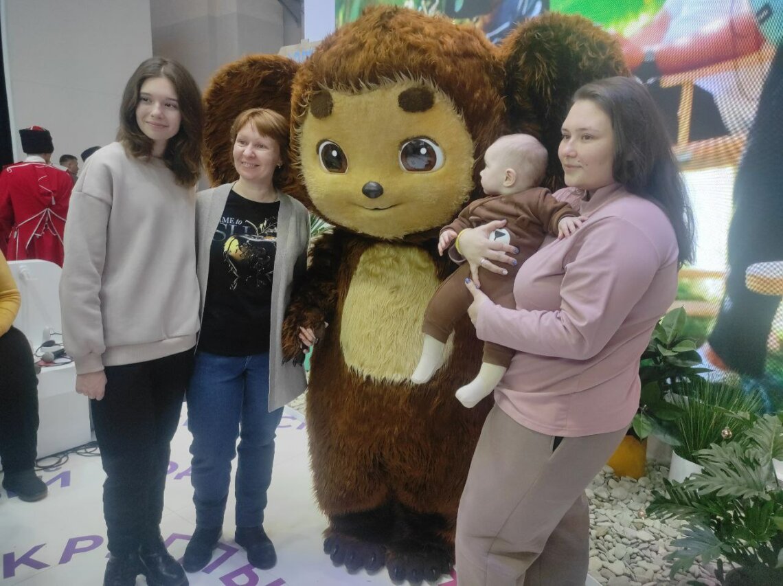 Краснодарский край – и место съемок многих известных российских картин. Самый новый из них – картина «Чебурашка». Съемки проводились в Сочинском дендрарии. Именно поэтому на стенде Краснодарского края фотосессию устроил большой и добрый Чебурашка. Люди подходили и с радостью обнимались с ним. Тут же со всеми фотографировался краснодарский песочный Снеговик.