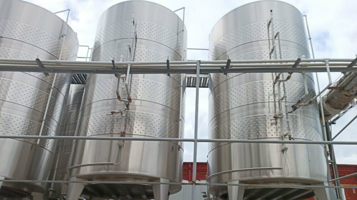 Слева расположены два приемщика винограда: сюда собранный урожай высыпается и продвигается внутрь цеха. Сейчас в цехе проводится ремонт, устанавливается новое оборудование – все своими руками, руками людей, которые здесь работают. Это семь мужчин и семь женщин.