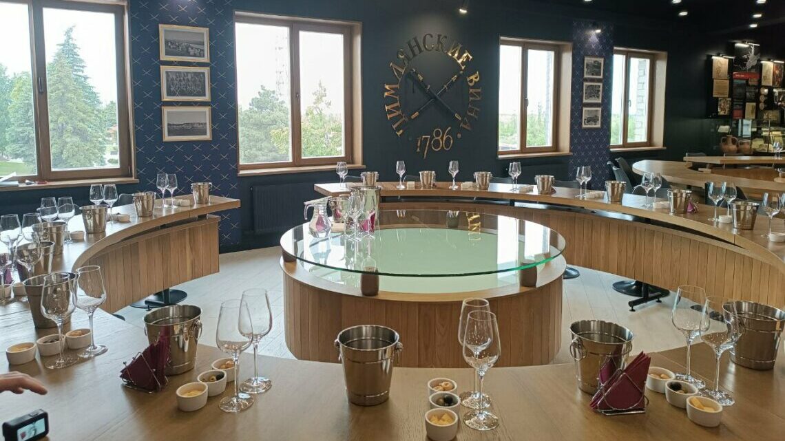 А вот где напитки можно и нужно пробовать, так это в дегустационном зале, оборудованном специальными круглыми столами. Каждому гостю выделено по два бокала, пиалы с закусками и металлическое ведерко — на случай, если вино не понравится и пить его не захочется.