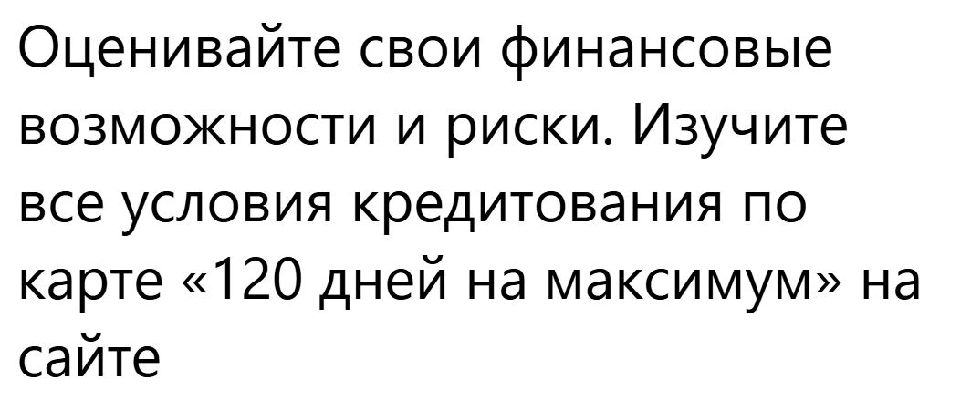Оценивайте свои финансовые возможности и риски. Изучите все условия кредитования по карте «120 дней на максимум» на сайте ПАО «БАНК УРАЛСИБ». Также подробнее об условиях по кредитным картам можно узнать по телефону 8-800-250-57-57 (звонок по России бесплатный) или в ближайших отделениях Уралсиба.