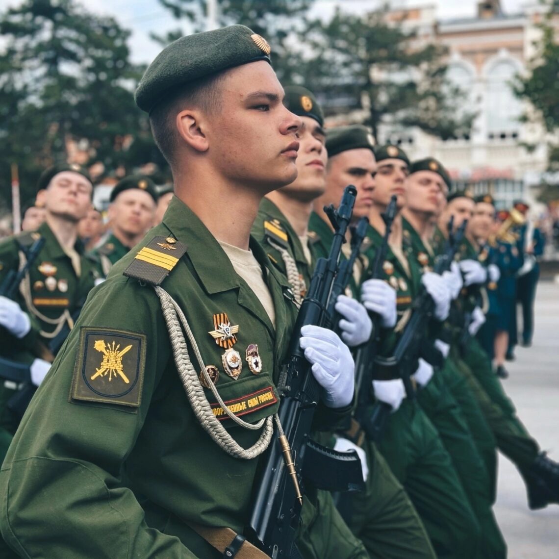Торжественным маршем прошли военнослужащие 150-й гвардейской Идрицко-Берлинской ордена Кутузова мотострелковой дивизии, одетые в форму времен Великой Отечественной войны сухопутных, морских войск и авиации. Продолжил праздник парадный расчет 133-й бригады правления 8-й общевойсковой гвардейской армии. После парадных расчетов по проспекту Платовскому прошла механизированная колонна боевой техники от времен ВОВ до СВО.