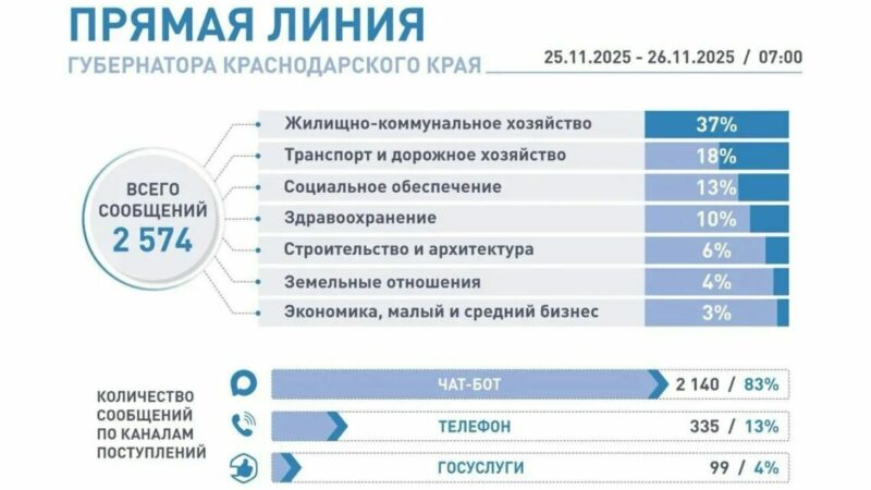 Жители Краснодарского края активно используют различные способы для обращения к губернатору Вениамину Кондратьеву в рамках «Прямой линии», которая пройдет 5 декабря в прямом эфире. По данным пресс-службы краевой администрации, большая часть вопросов поступила через чат-бот в мессенджере MAX (83%), 13% обратились по телефону, а 4% — через платформу «Госуслуги».
