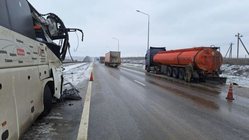 ДТП случилось 18 февраля в 07:50 на 867-м километре автодороги М-4 «Дон». По предварительным данным, водитель автобуса «Ютонг», следовавший по маршруту «Москва – Стаханов», выбрал небезопасную дистанцию и врезался в попутный грузовик «Скания» с полуприцепом-цистерной.