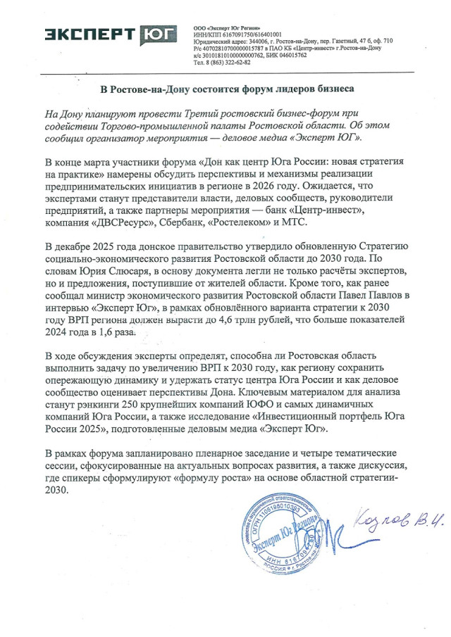 В конце марта участники форума «Дон как центр Юга России: новая стратегия на практике» намерены обсудить перспективы и механизмы реализации предпринимательских инициатив в регионе в 2026 году. Ожидается, что экспертами станут представители власти, деловых сообществ, руководители предприятий, а также партнеры мероприятия — банк «Центр-инвест», компания «ДВСРесурс», Сбербанк, «Ростелеком» и МТС.