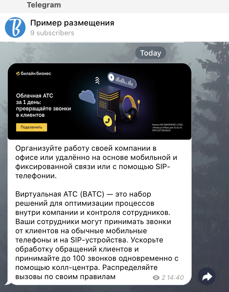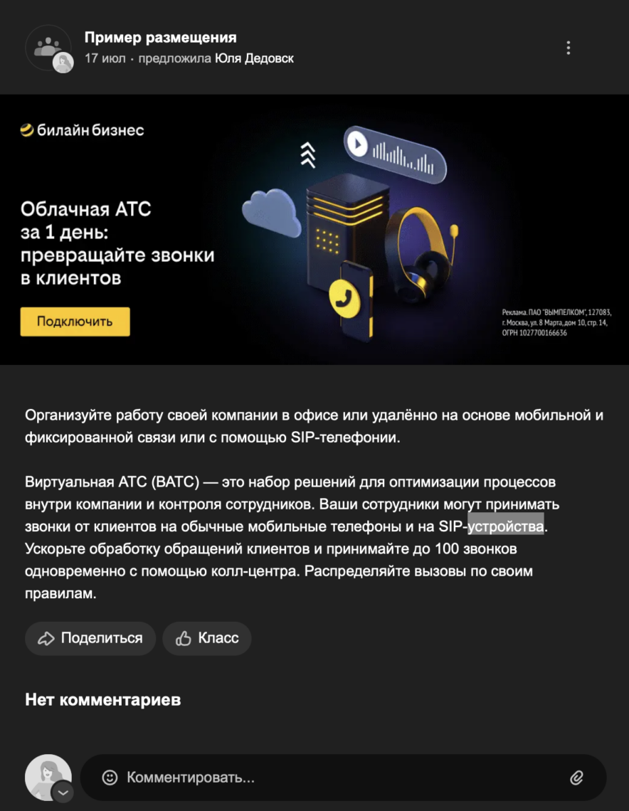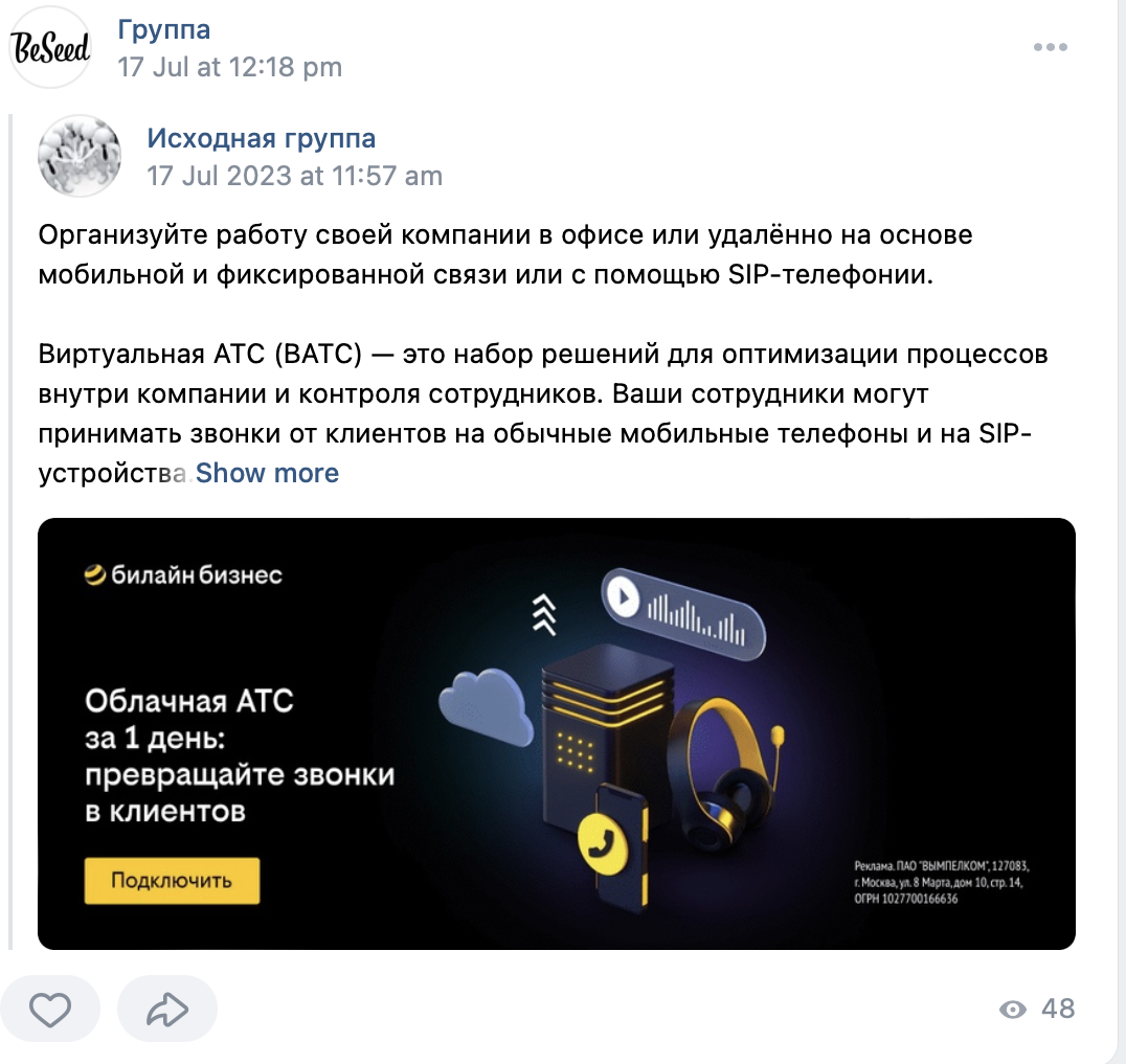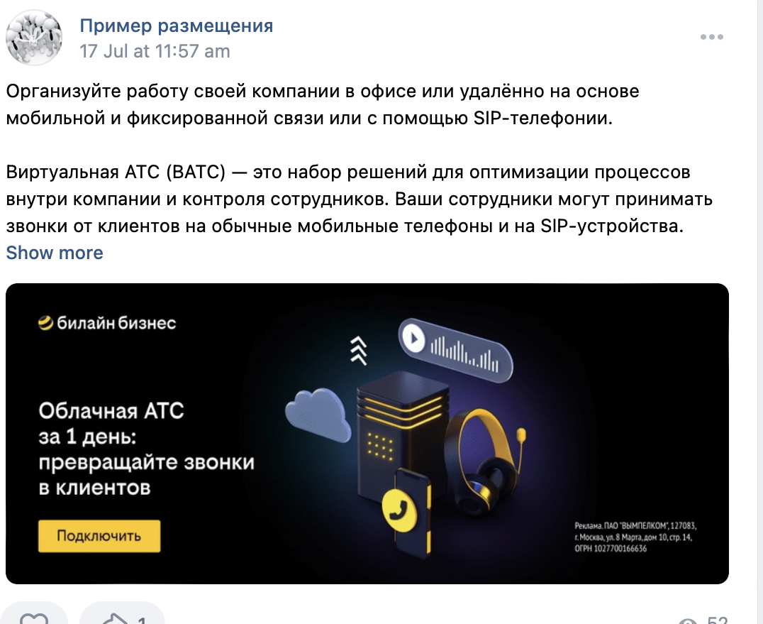 билайн adtech – подразделение по рекламным технологиям билайн бизнес – обеспечил для бизнеса возможность размещения постов и репостов в социальных сетях через платформу билайн.ПРОдвижение. Публикация постов возможна в Telegram, ВКонтакте и Одноклассниках. В сервис интегрирована регистрация в ОРД. Минимальный бюджет кампании – от 10 тыс. рублей с НДС. Для тарификации услуг применяется модель оплаты за показы.