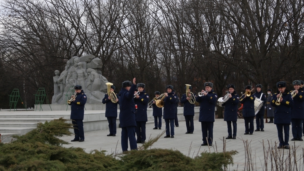 Память погибших воинов-освободителей почтили минутой молчания, на церемонии прозвучали гимны России, Кубани и Краснодара.