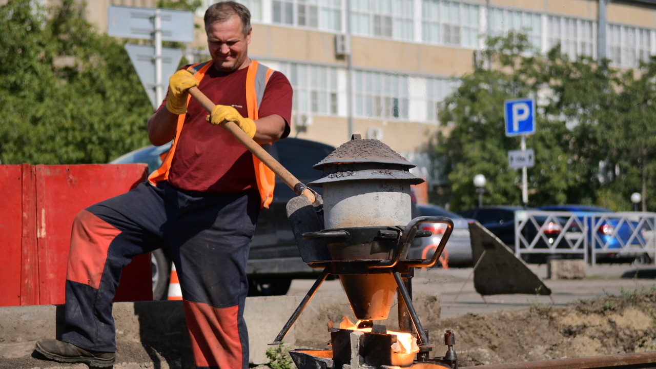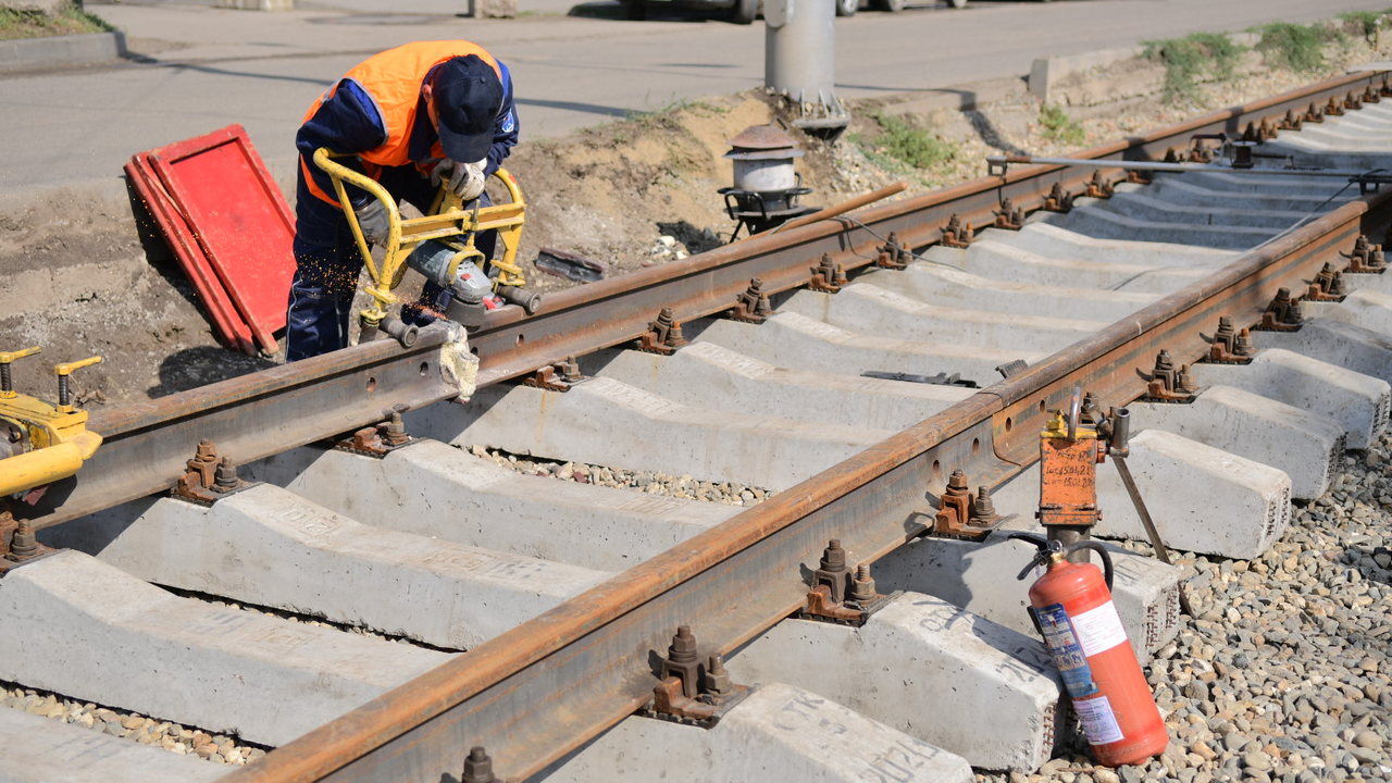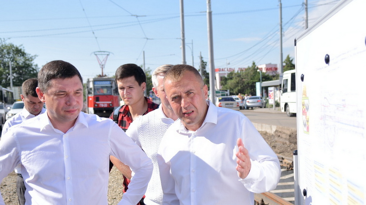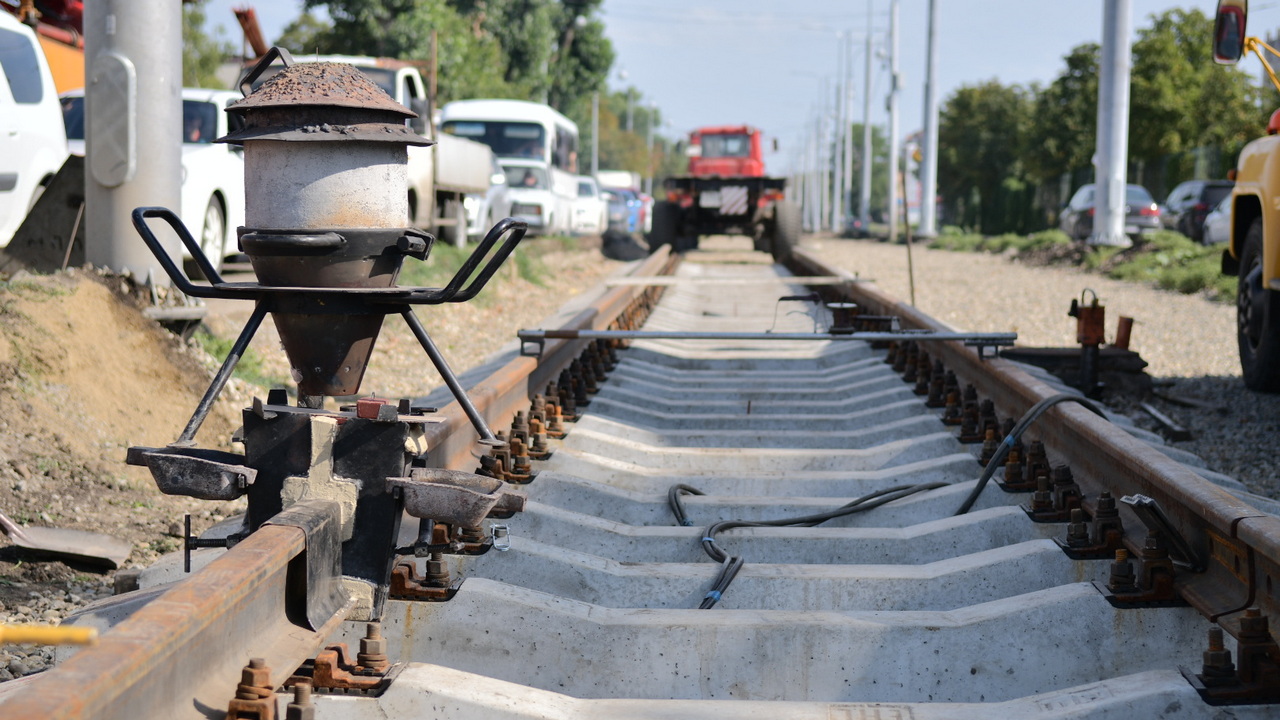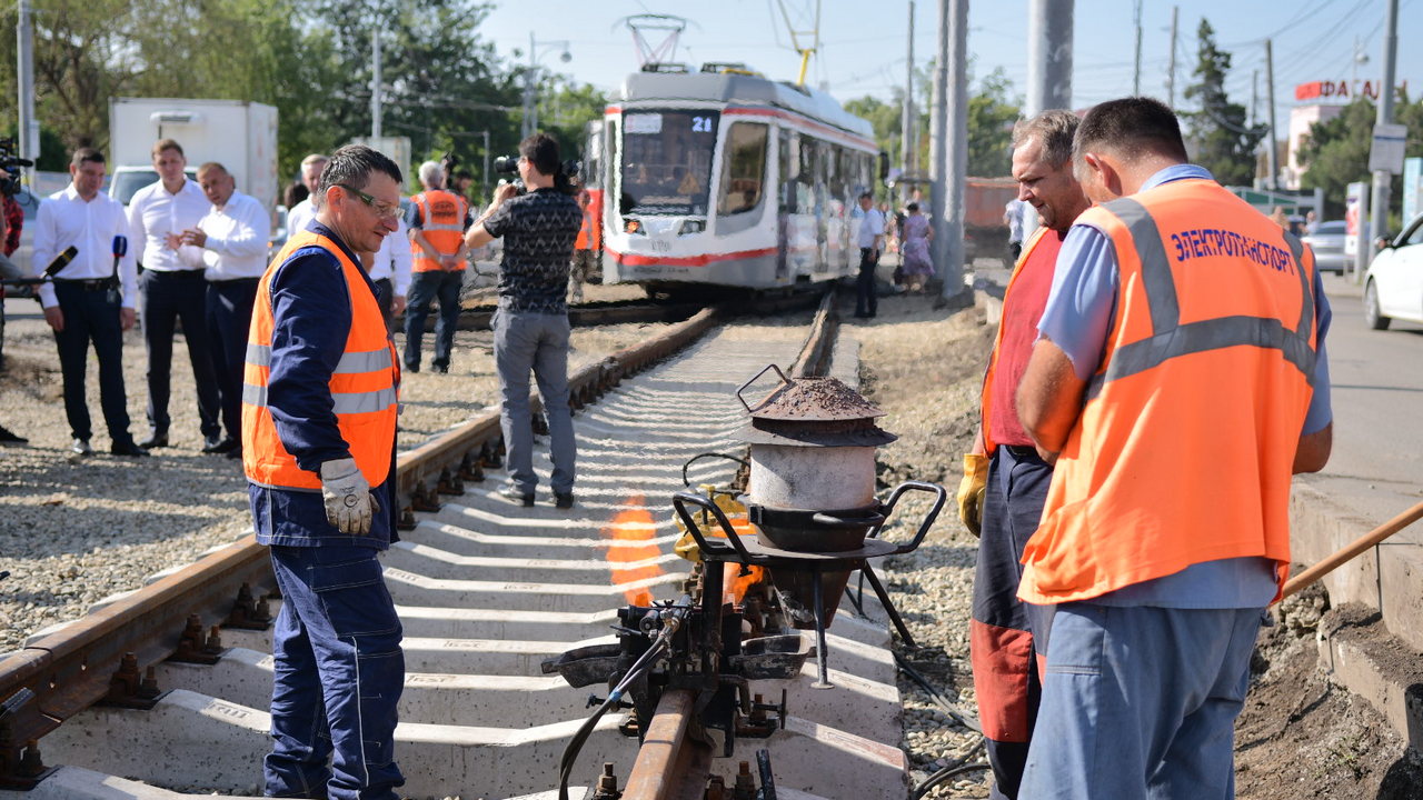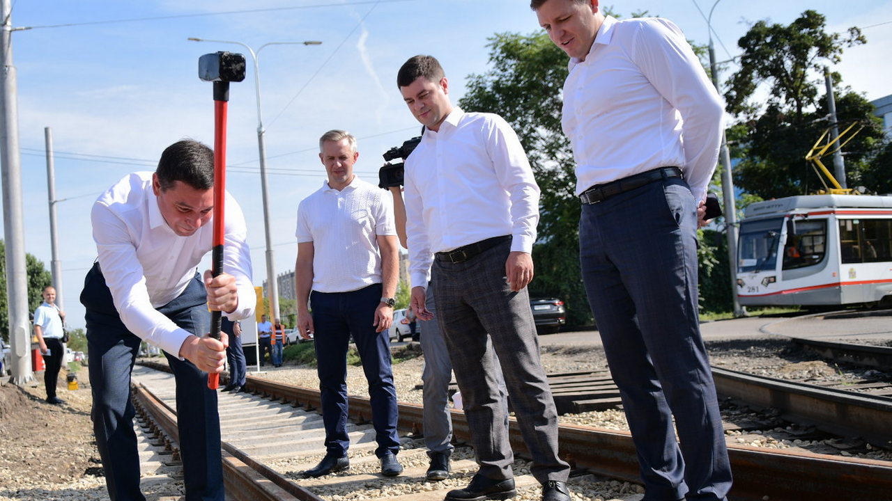 В Краснодаре стартовала укладка рельсошпальной решетки для трамвайной линии на улице Московской. Символический гвоздь для скрепления рельсов и шпал у начала нового полотна вбил глава города Евгений Первышов.